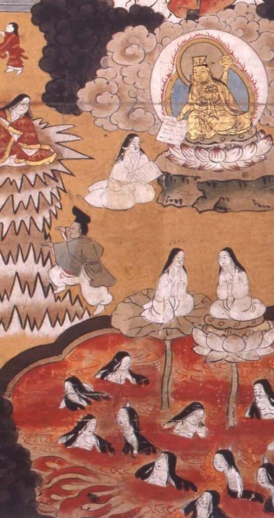 「血の池地獄」のすぐ上部に描かれているのが救済のシーンで、如意輪観音から紙を渡されている女性の姿があります。この紙が『血盆経』で、生前に唱えたり、書き写して持ち歩いたりすることで、この「血の池地獄」からの救済を受けることができると考えられてきました。