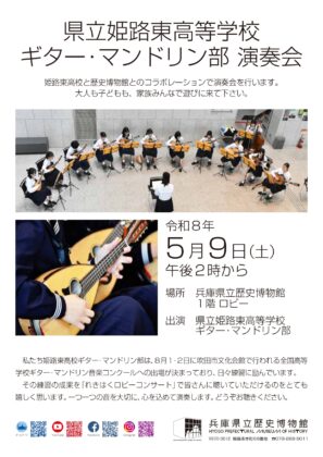 5月9日(土)にロビーコンサートを開催します。 今回は、県立姫路東高校ギター・マンドリン部のみなさんに出演いただきます。 やさしい音色に包まれ、至福の時をお過ごしください。