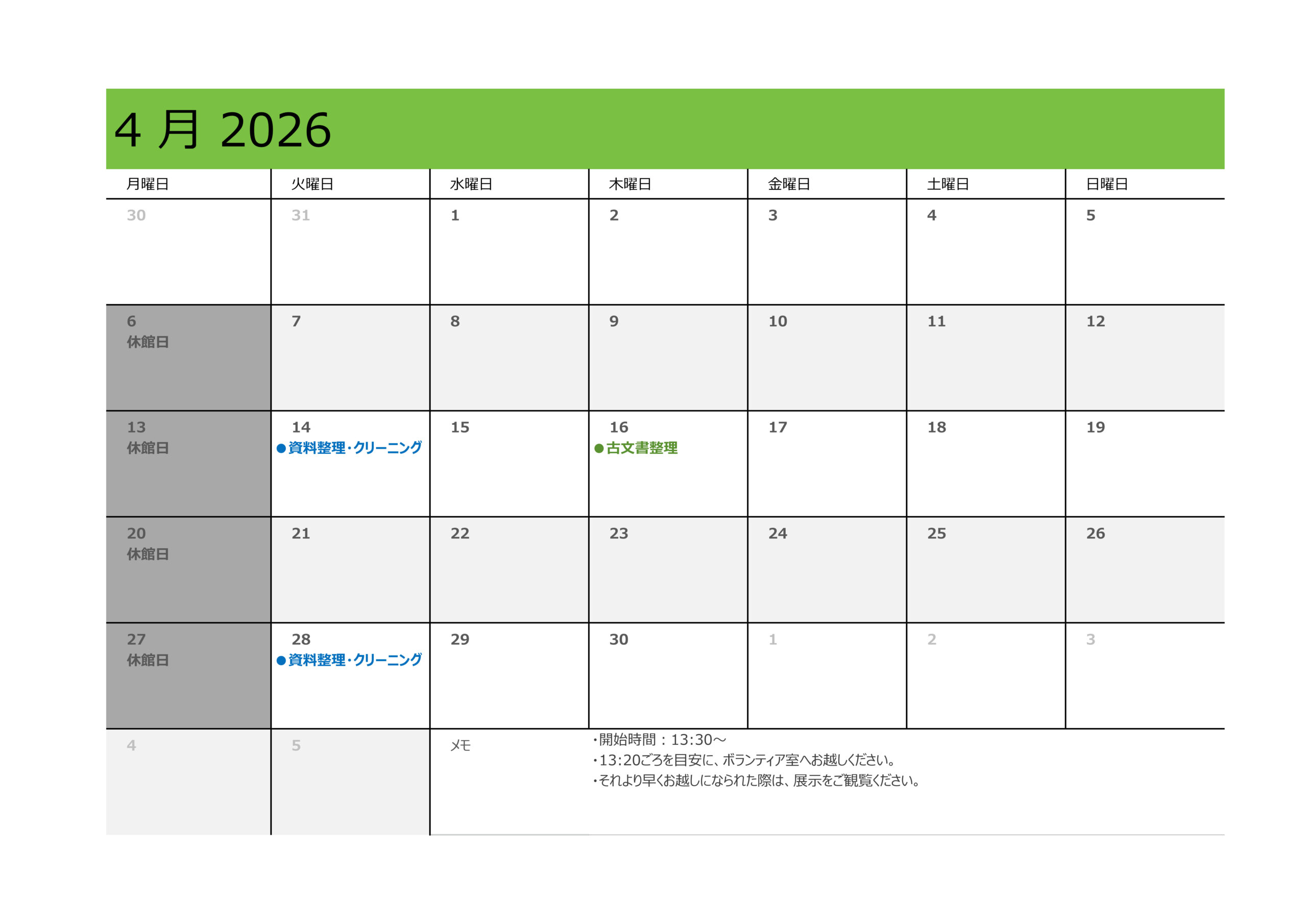 令和8年度(令和8年4月)の資料整理ボランティアの活動スケジュールを作成しましたのでご連絡いたします。